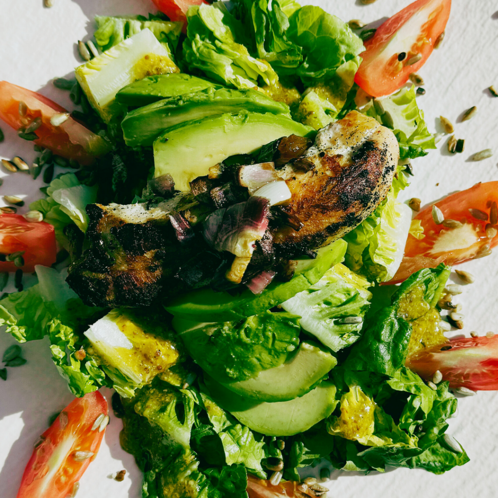 In der Zwischenzeit den Salat waschen und je einen Salat kleinschneiden und auf einem Teller anrichten. Ebenso die Tomaten und die Avocados vierteln und auf den Tellern anrichten. Die Avocados mit Just Spices Avocado Topping würzen.